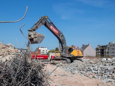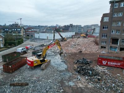 Un défi supplémentaire était la présence d'un ruisseau souterrain sous les blocs A et I. Comme il n'était pas visible, les machines lourdes devaient être soigneusement positionnées pour maintenir la stabilité. La situation en milieu urbain a également apporté des points d'attention supplémentaires, tels que la gestion de la poussière et du bruit, surtout à proximité d'une école. Grâce à une communication fluide avec la Ville de Roulers, les demandes de permis et la coordination se sont déroulées de manière particulièrement efficace.