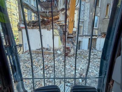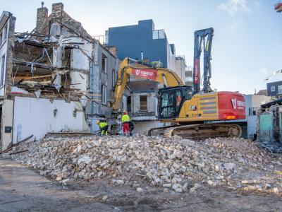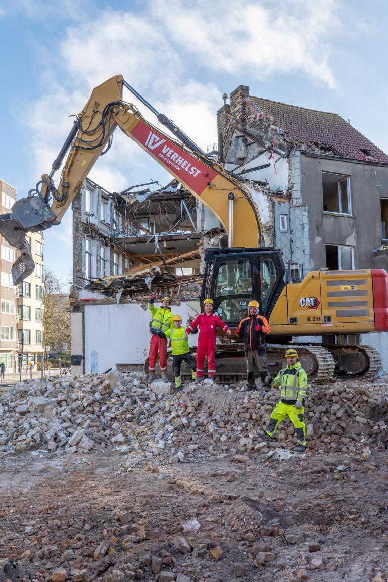 De werken verlopen gefaseerd. Eerst werden alle panden zo goed als mogelijk van binnenuit ontmanteld. Intussen is alle asbest zorgvuldig en volgens de voorschriften verwijderd door onze eigen opgeleide medewerkers. De bovengrondse sloop is nu ongeveer één derde ver gevorderd. We zijn gestart aan de hoek met het voormalige gebouw “Le Relais” en schuiven stap voor stap op richting de erfgoedgevels, telkens met oog voor veiligheid, omgeving en planning.